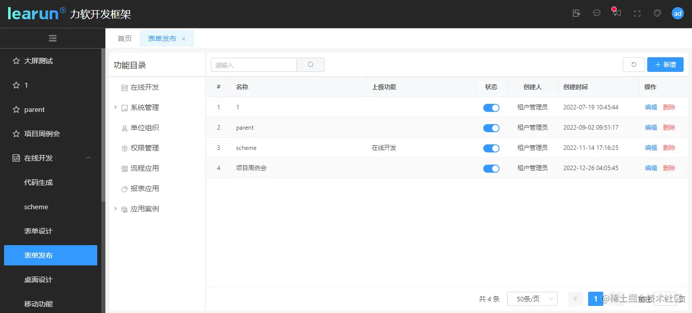 自定义表单开发完成后可以直接发布成菜单功能使用,用户进入[表单发布]界面,点击[新增]按钮,即可打开功能发布界面。