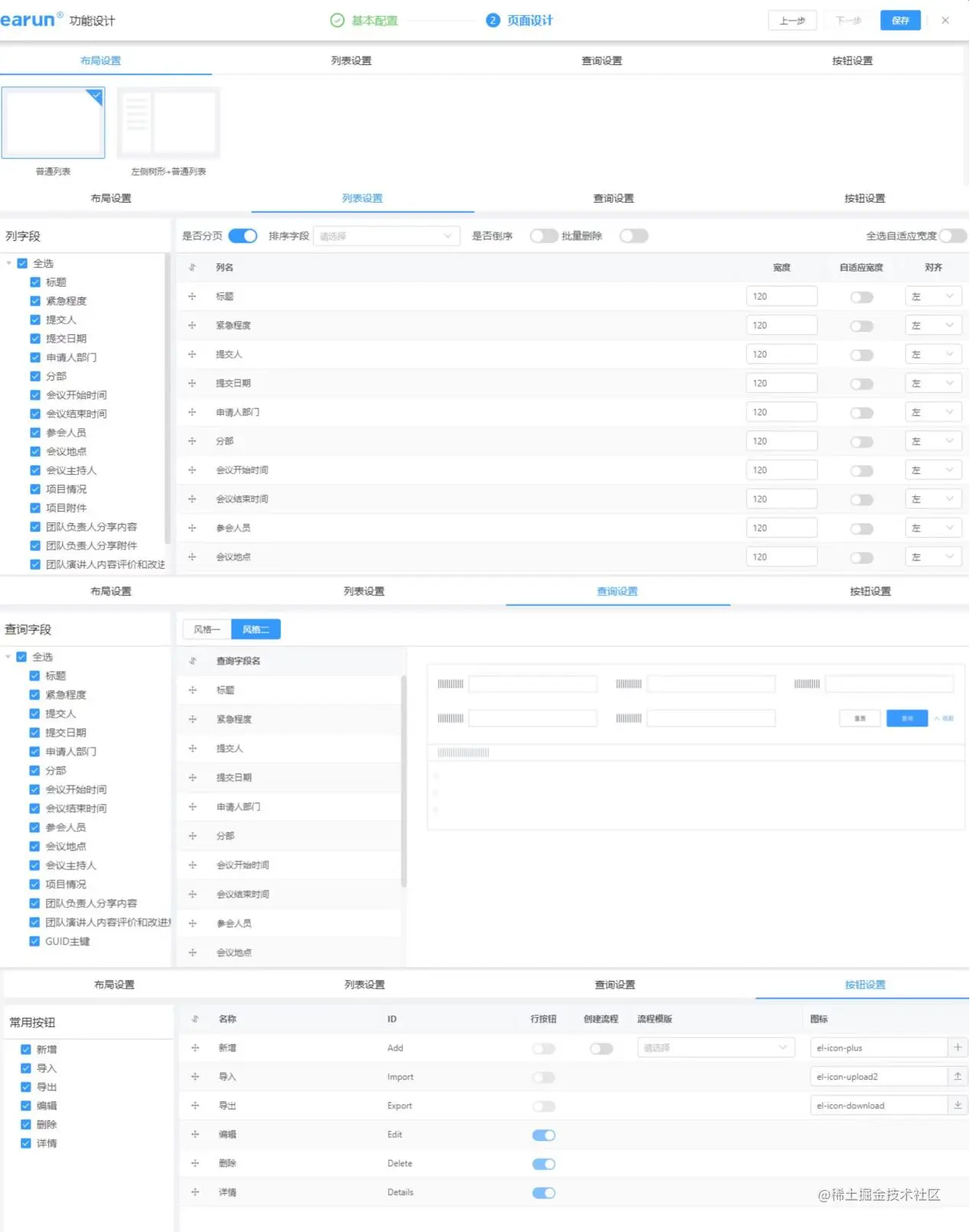 根据向导依次完成布局设置、列表设置、查询设置、按钮设置。
