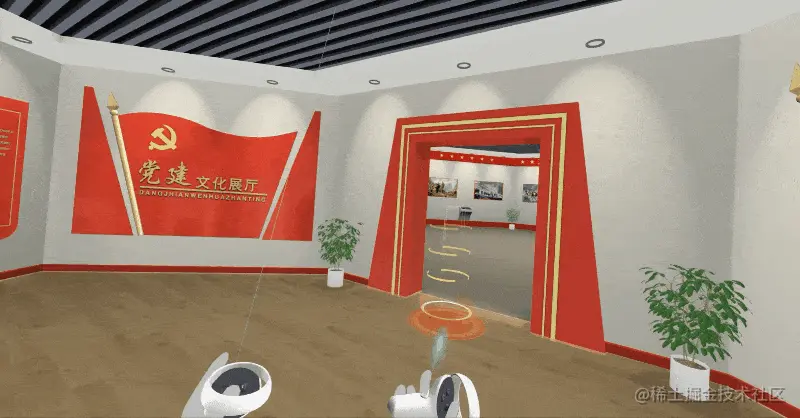 在文化展厅领域,虚拟现实 VR 技术的应用涉及展览、旅游、休闲等方面。图扑软件曾搭建智慧党建展厅场景中,以三维可视化场景为载体,整体场景搭建好后,导入到虚拟现实软件中,进行 360° 实时展示实际党建展厅各类主题元素。依托虚拟现实 VR 技术,让参观者与场景虚拟物品或抽象概念进行交互操作。