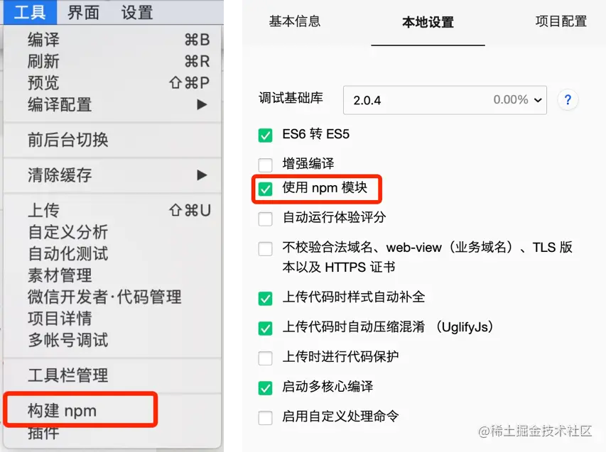 需要手动在 project.config.json 内添加如下配置,使开发者工具可以正确索引到 npm 依赖的位置。