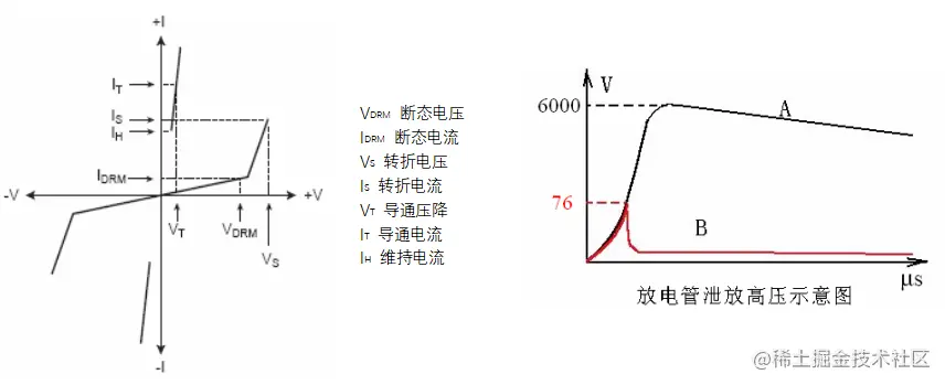 半导体放电管的工作模式是:当外加电压低于其断态电压VDRM时,半导体放电管的漏电流极小,相当于开路;当外电压大于VDRM时,开始发生击穿;当外电压进一步加大后,半导体放电管的两端变成导通状态,相当于短路,可以泄放很大的电流;当外电压撤去以后,管子即可恢复断态。