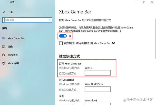 **第一步:**打开Windows电脑系统设置,进入到【游戏设置】界面;将【Xbox Game bar】开启;在电脑键盘上按下【Win+G】,即可进入到Windows电脑录屏界面;