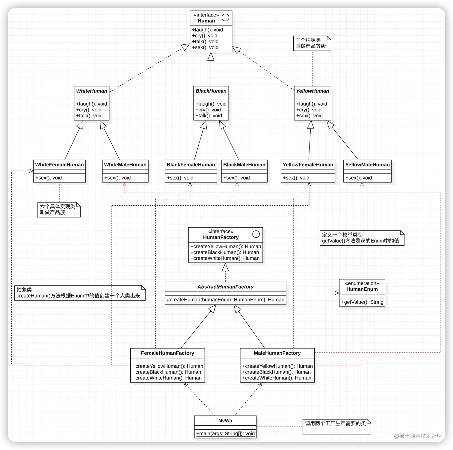 在工厂方法模式一文中,使用女娲造人的案例介绍了工厂方法模式的思想和简单实现,还是使用同样的案例,但创造的人类的粒度更细,除了肤色以外,还要区分性别。