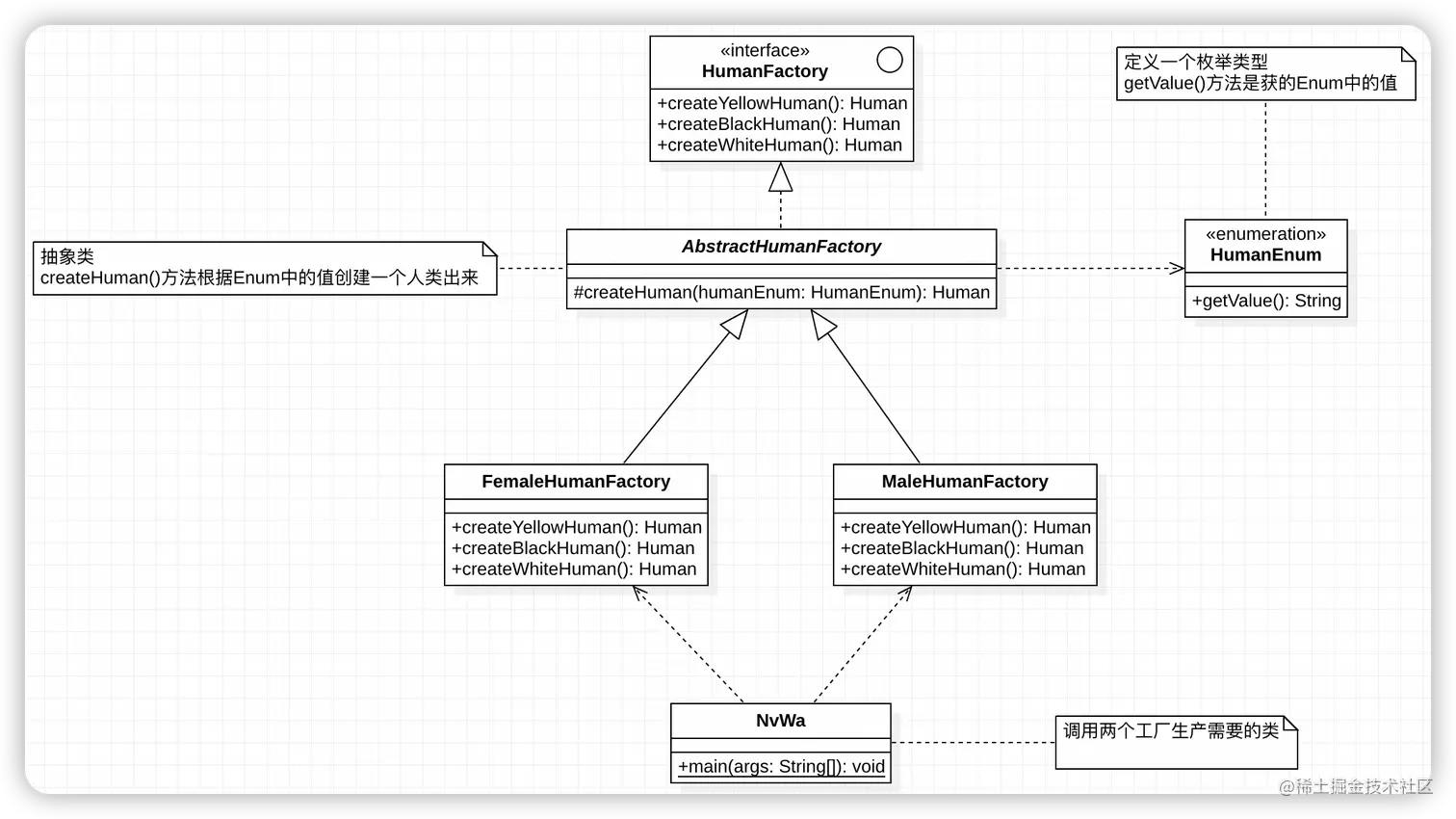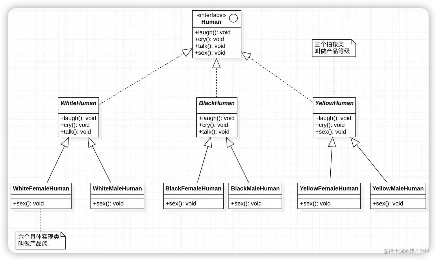 - 抽象工厂中只实现了createHuman()方法,目的是简化实现类的代码量