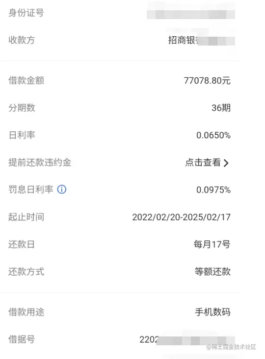 但实际情况是,除了1%的违约金外,木木的借款年利率接近24%,逾期罚息年利率接近36%,远超监管要求的24%上限,且在月薪6000出头的情况下获得了招联消费金融近10万元的贷款,招联所提倡的似乎是**“坚持‘惠应适度’,力求‘普无止境’”。**