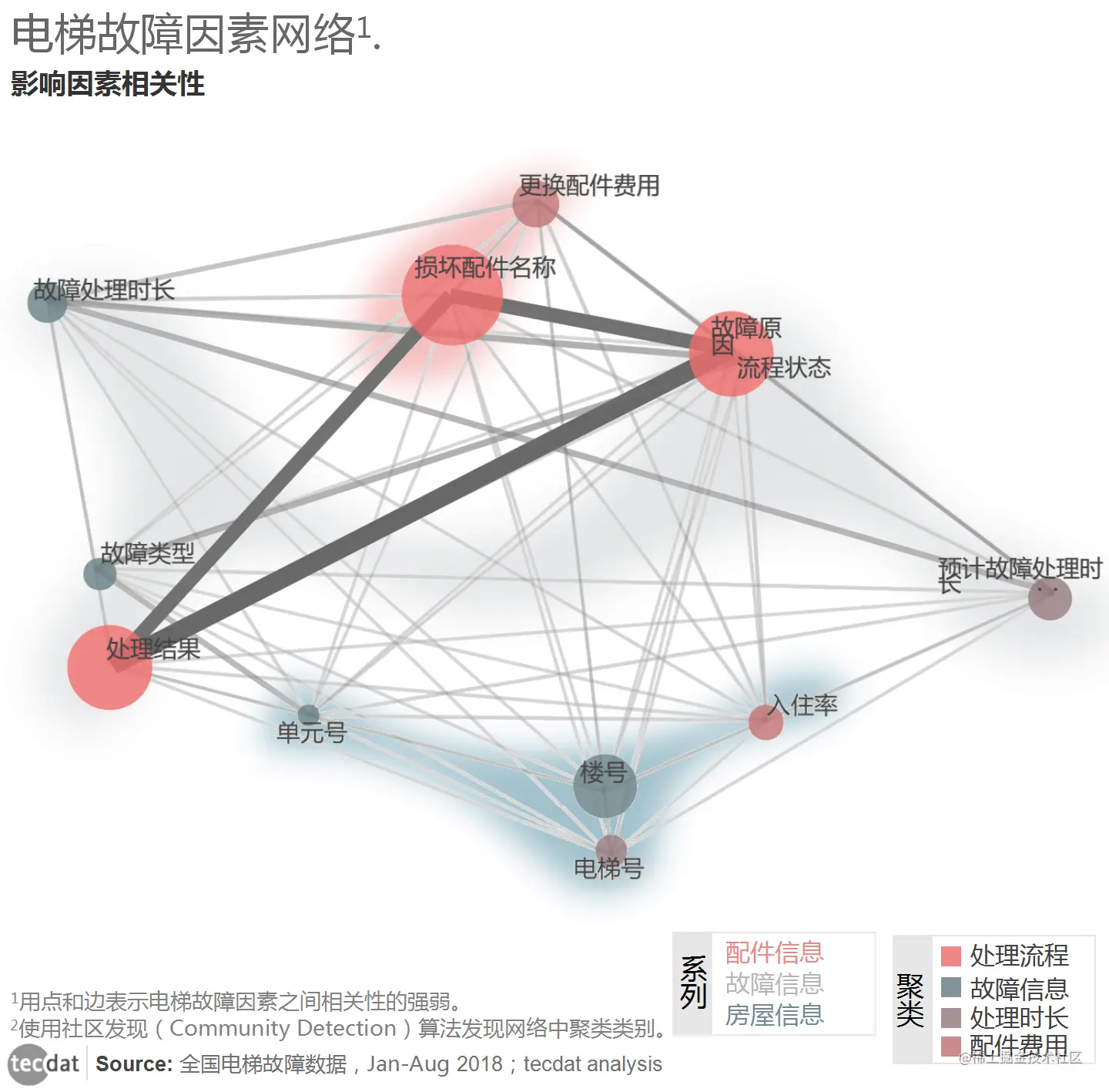 社区发现算法结果显示,电梯故障因素可以从配件信息、故障信息和房屋信息三个维度来进行分析。因此,准确确定故障原因和预计故障处理时间可以提高故障处理效率。从聚类结果中可以判断电梯所处的房屋信息对故障处理时长也有一定影响。