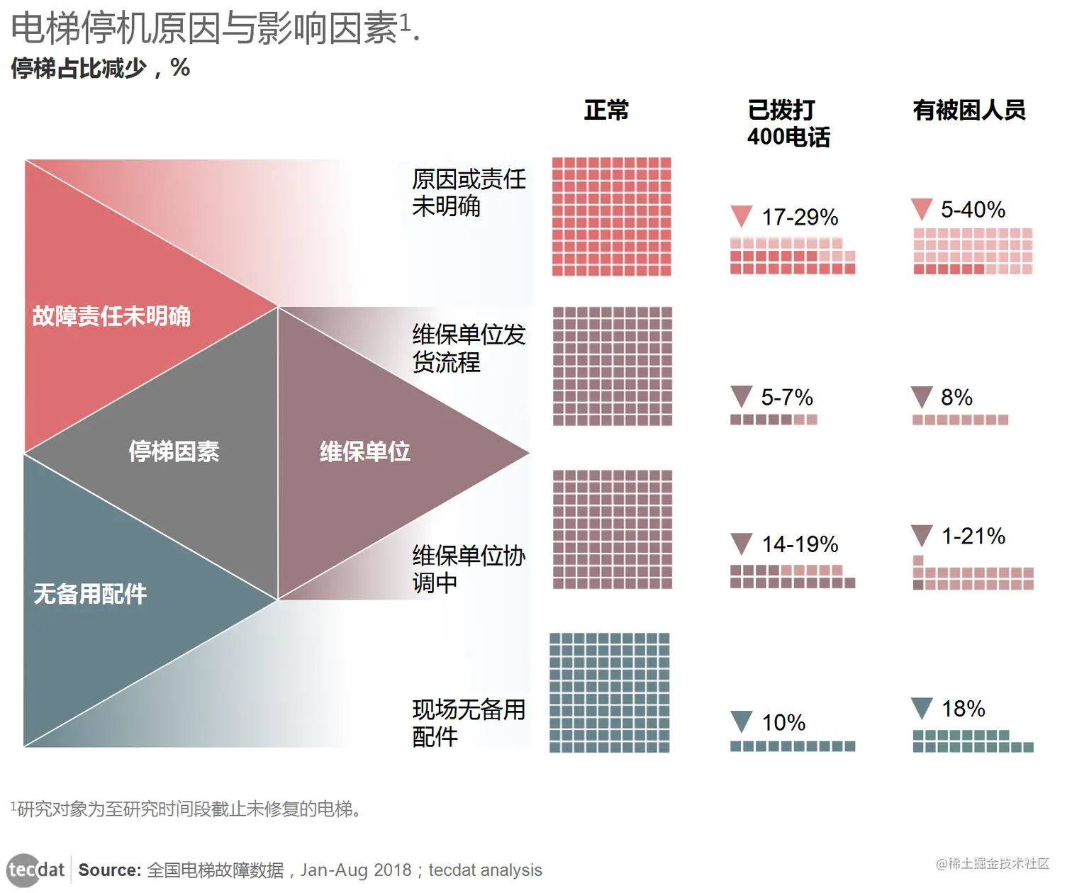 停梯的因素可以分成三个方面:故障责任未明确、维保单位流程中与无备用配件。相比于正常状态电梯,拨打400客服电话可以很大程度上减少由于原因和责任不明确所导致的停梯比例,一定程度上加快维保单位维修的进程,从而减少停梯比例。同时,有被困人员的电梯由于原因和责任未明确而停梯的情况较少出现,同时也减少了维保单位协调和无配件而停机的比例。