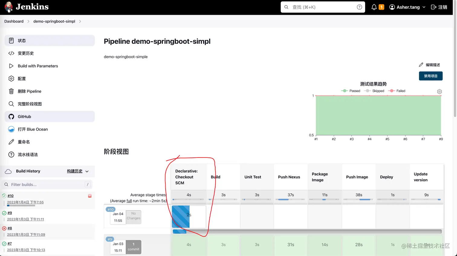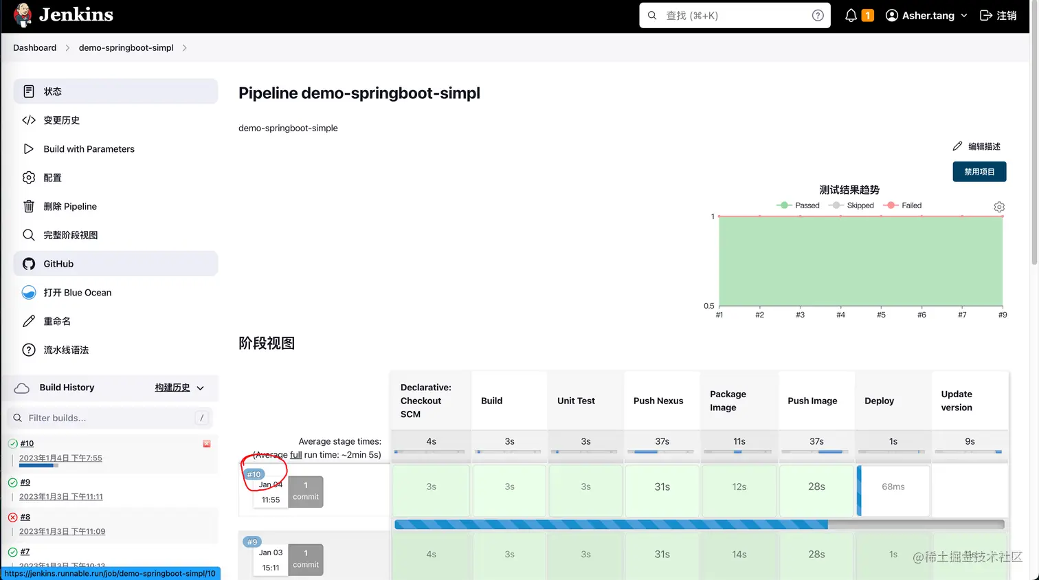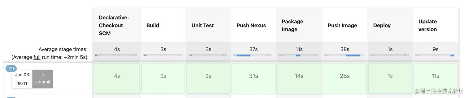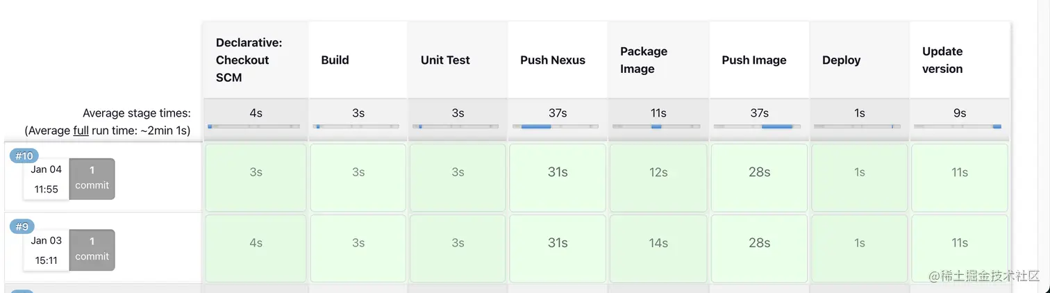 在Jenkinsfile中我定义了7个stage,分别是Build, Unit Test, Push Nexus, Package Image, Push Image, Deploy, Update version