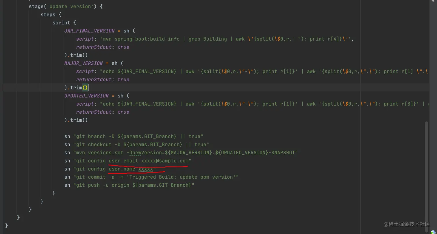 在这个 Update version Stage中需要修改你的git邮箱地址和username,因为在步骤2.4中已经配置了公钥在GitHub上,且在Jenkins agent 中配置了 /root/.ssh的目录映射,所以这里只需要配置用户名和邮箱就行。
