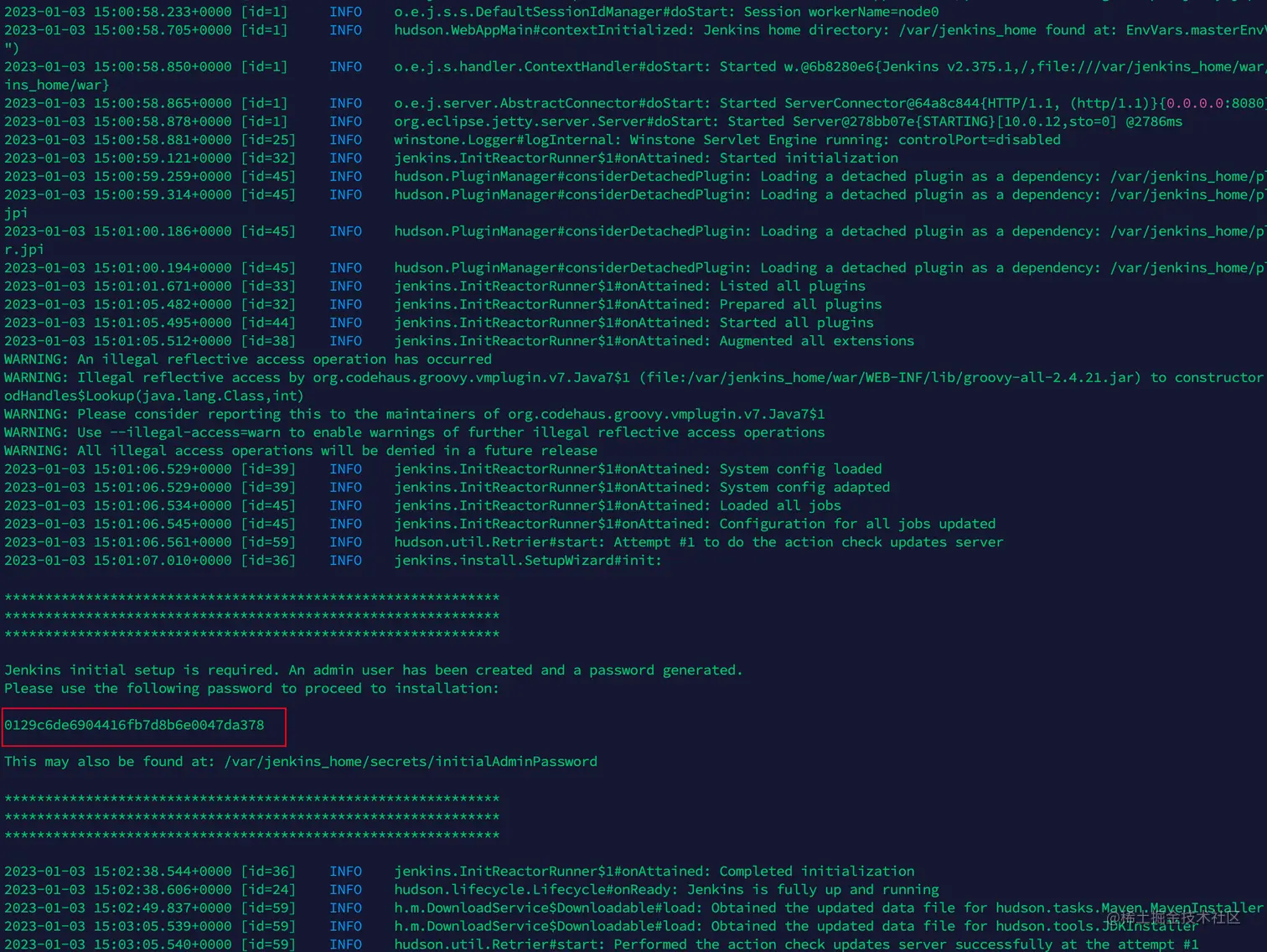 我们可以直接使用 docker logs jenkins 拿到密码