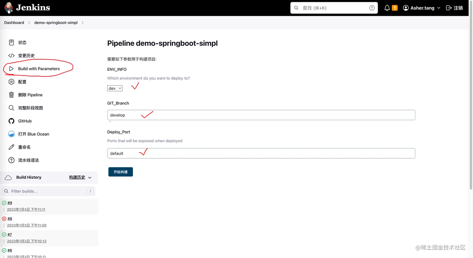 终于到了最后一步,回到Jenkins的面板, 点击Build with Parameters, 填入你的参数,进行构建