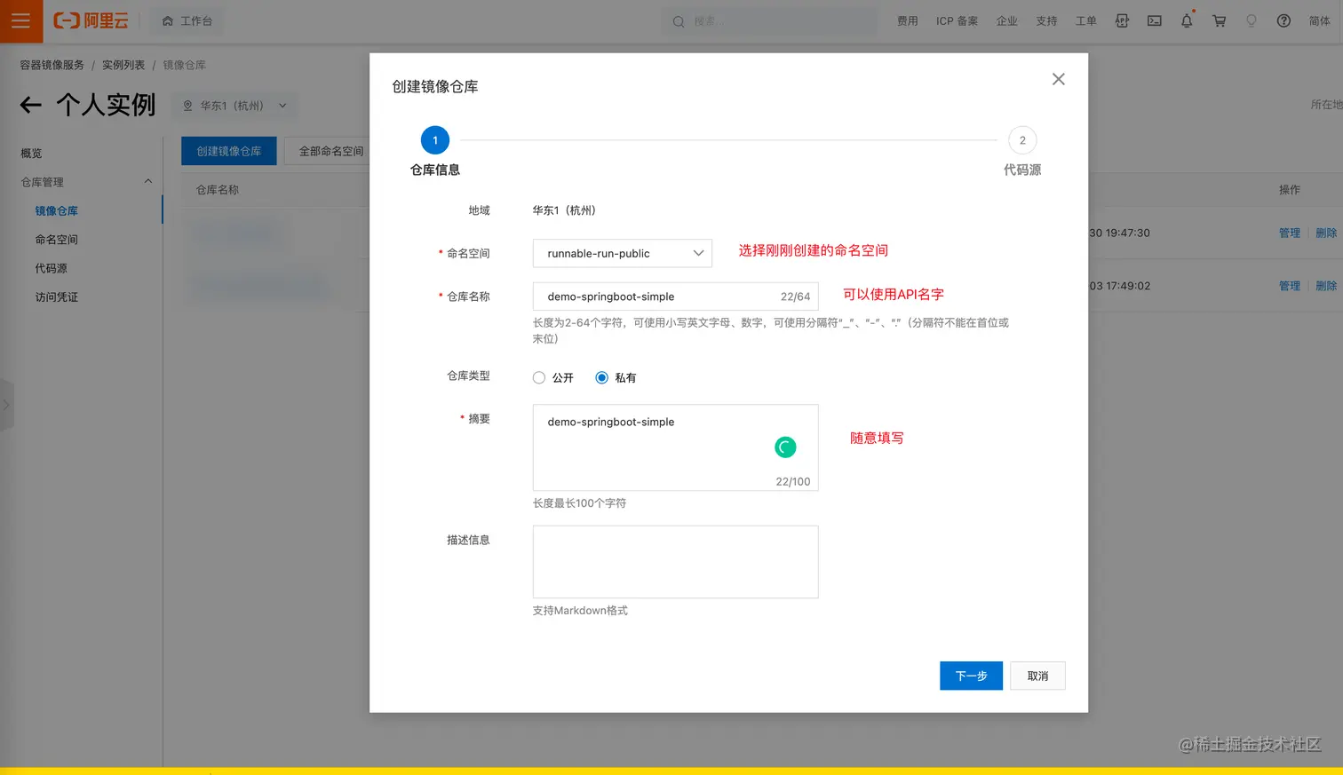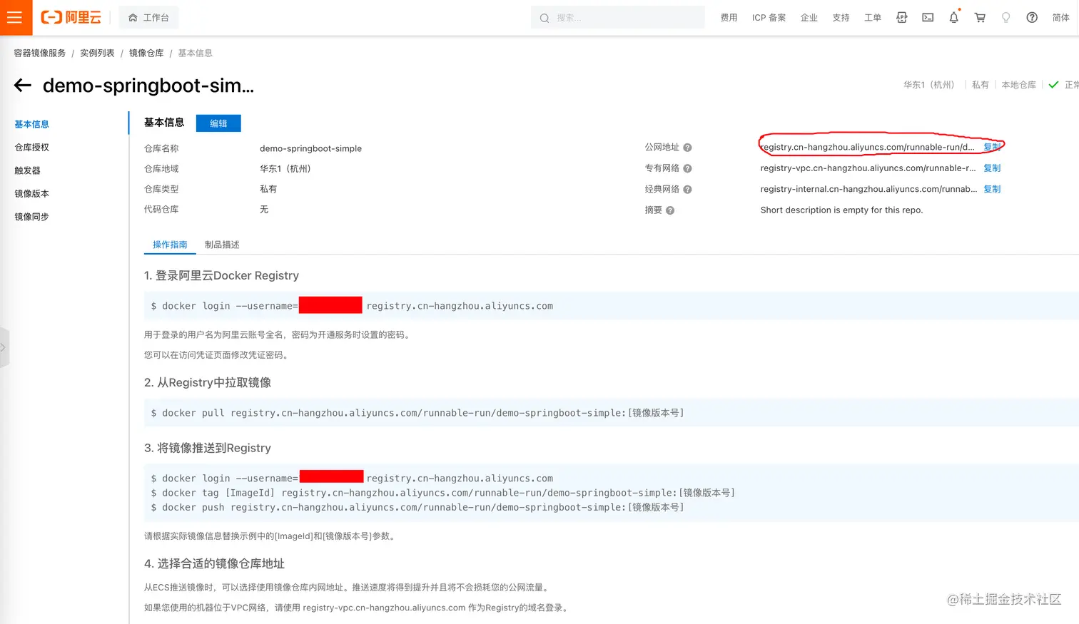docker.namespace是在阿里云的Docker容器镜像仓库时创建的。docker.registry.address则是镜像仓库基本信息中的公网地址,例如:registry.cn-hangzhou.aliyuncs.com
