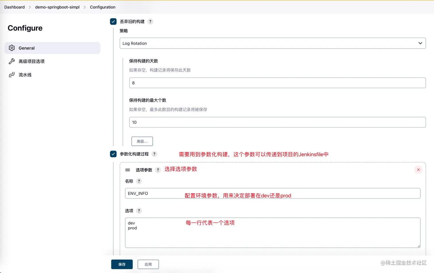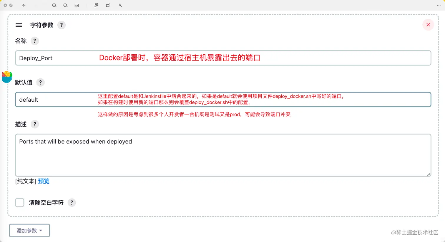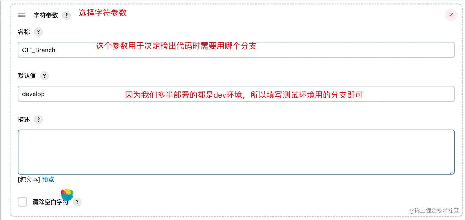 添加参数化构建过程,总共会添加三个参数ENV_INFO,GIT_Branch,Deploy_Port