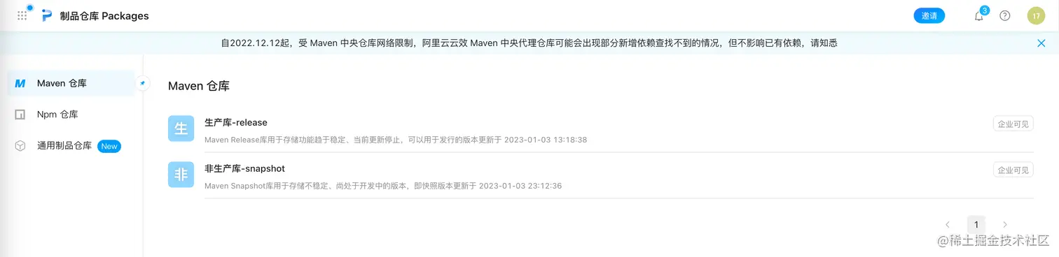 注册并登录进去之后,我们可以看到有两个对应的仓库,生产库-release 和 非生产库-snapshot,分别用来存放我们不同环境的jar包,如果你的 pom.xml中的version带 -snapshot,那么推送的就是 非生产库, 如果不带 -snapshot ,推送的就是生产库。这里需要注意的是,生产库的jar包是不允许重复推送的。