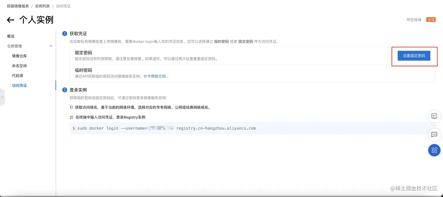 在个人版中,访问凭证中,设置 固定密码 ,这个密码之后会在项目demo-springboot-simple 中的 deploy_docker.sh 用到。