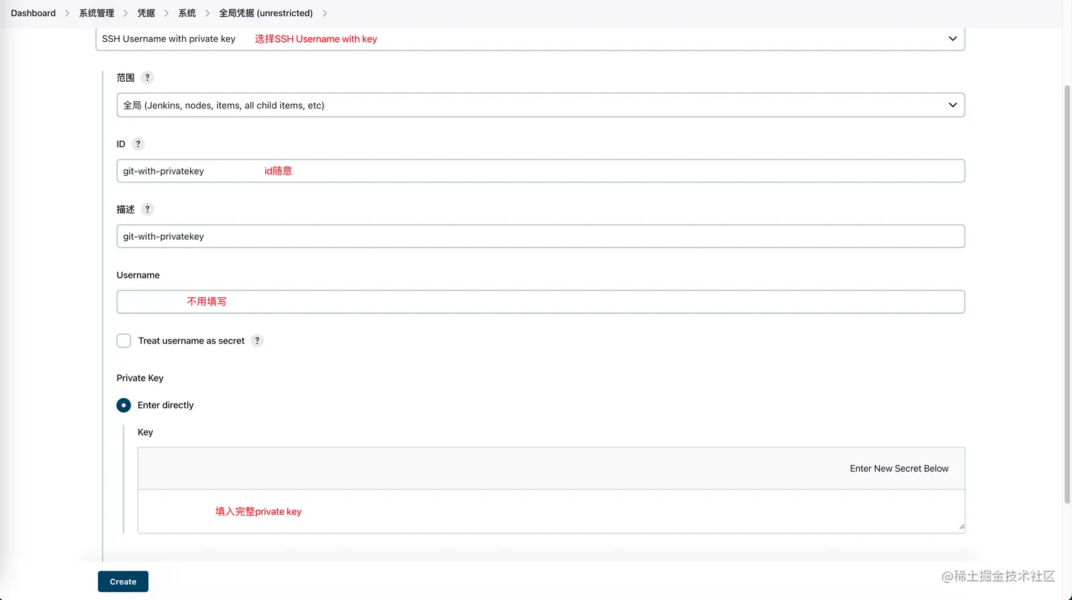 然后把私钥文件 id_rsa 中的内容配置到刚刚Jenkins的那个地方