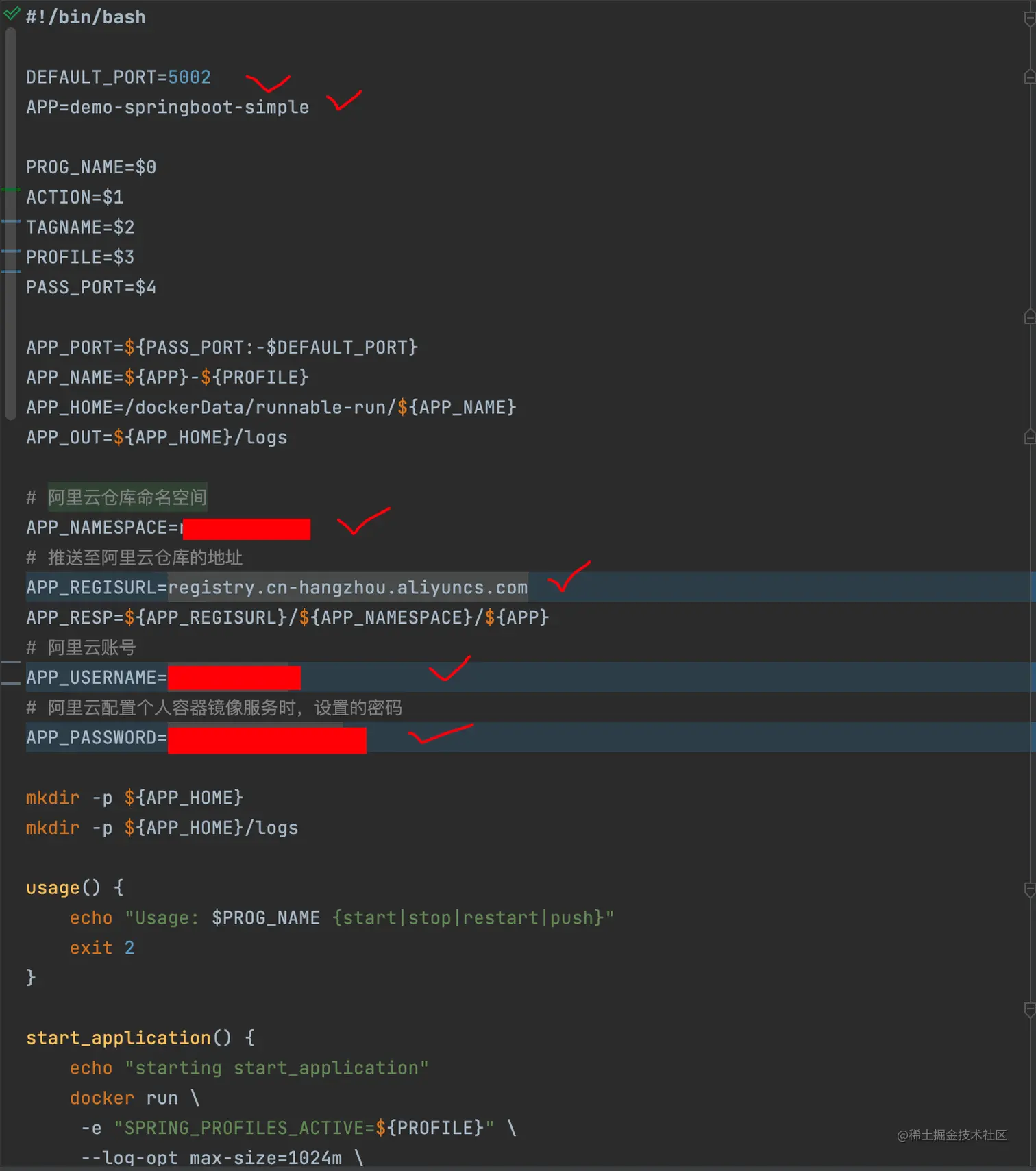 说完了Jenkinsfile,希望你已经明白Jenkins执行时的主要的流程,那么在 deploy_docker.sh中的内容是docker部署到本地和docker推送到Docker容器镜像仓库时的一些命令。