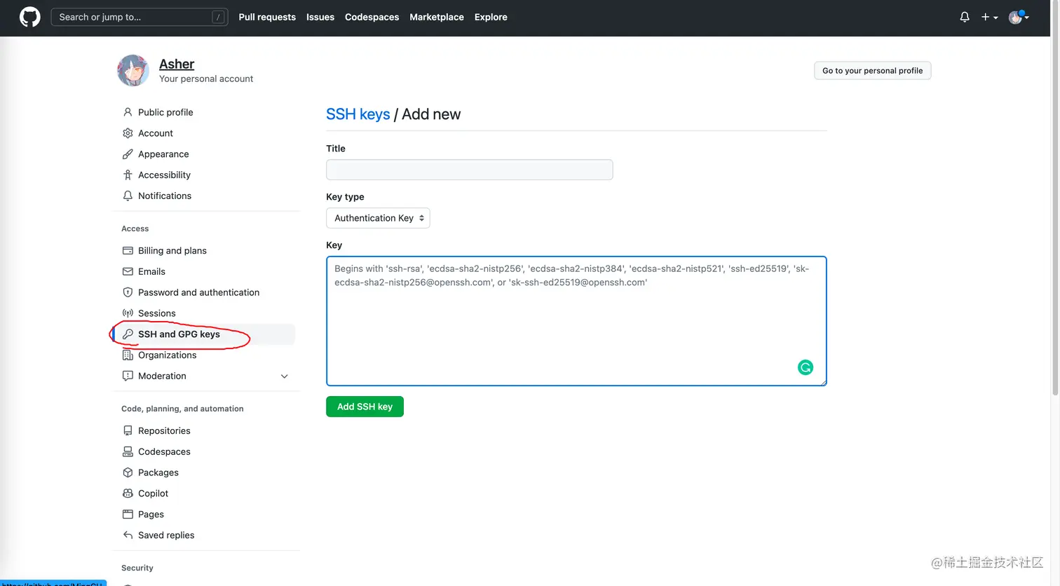 然后公钥文件 id_rsa.pub中的内容复制到GitHub SSH配置中