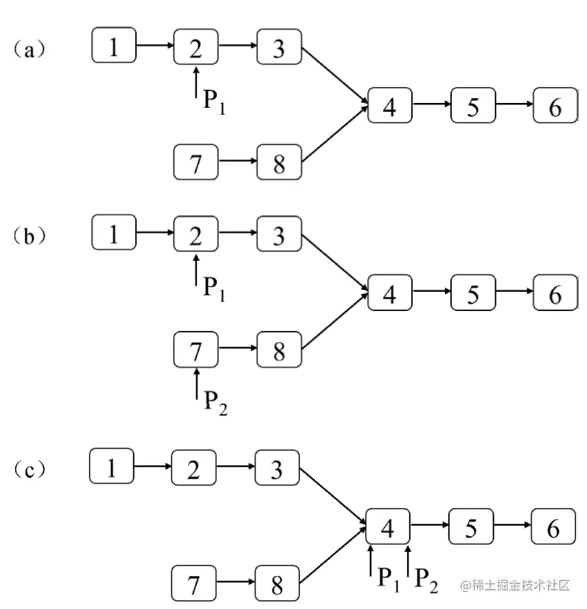 当指针 pA 和 pB 指向同一个节点或者都为空时,返回它们指向的节点或者 null。