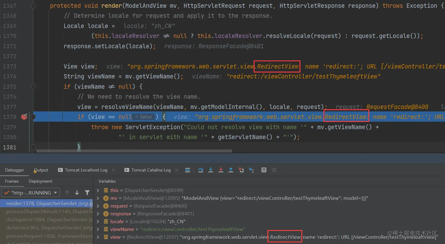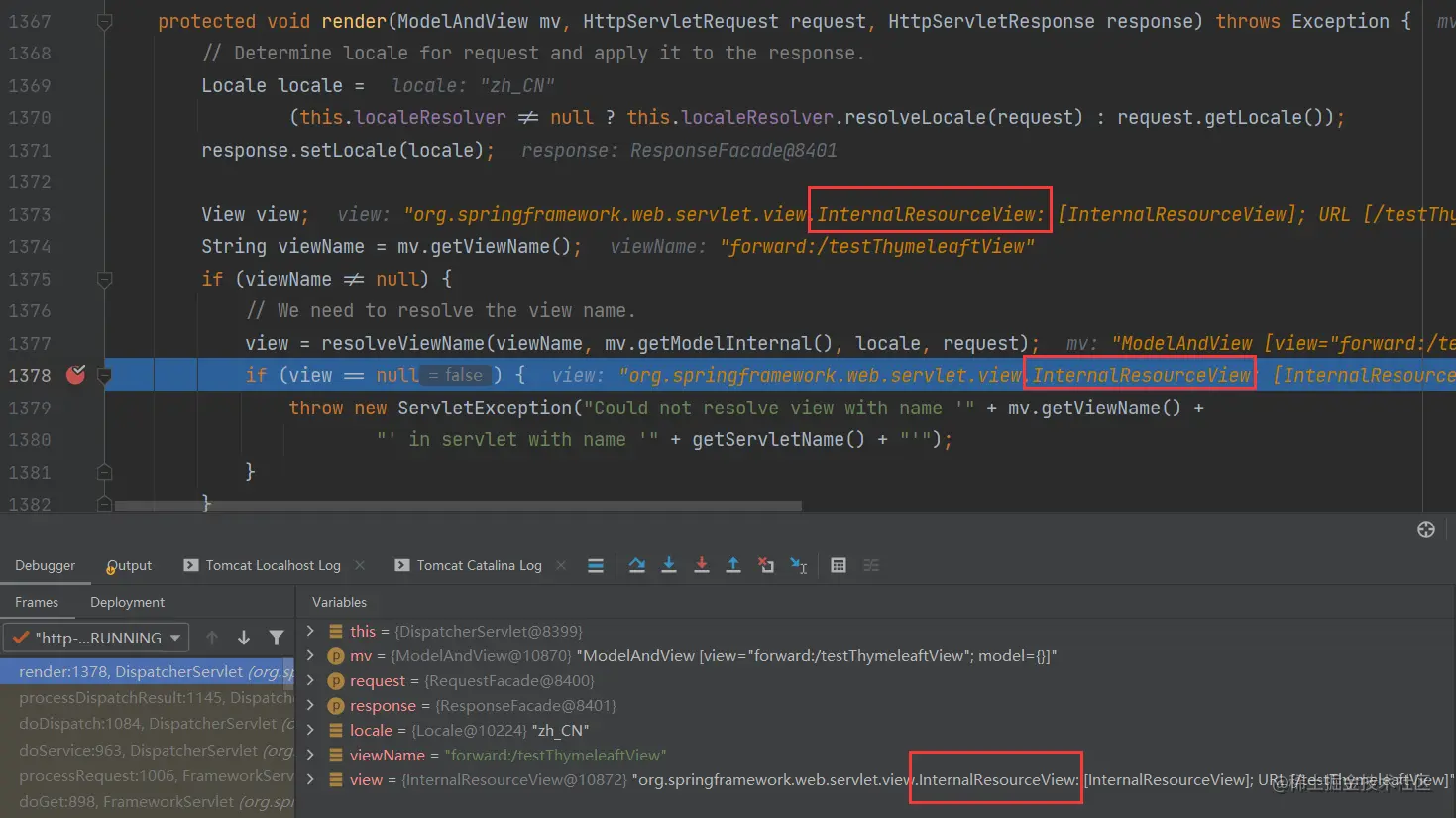 断点调试,查看创建的View视图对象为InternalResourceView对象