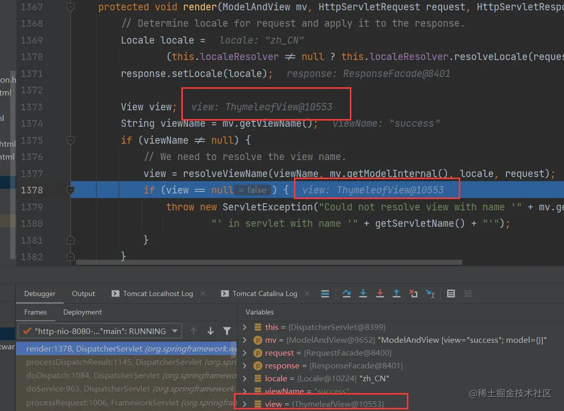 断点调试,查看创建的View视图对象为ThymeleafView对象