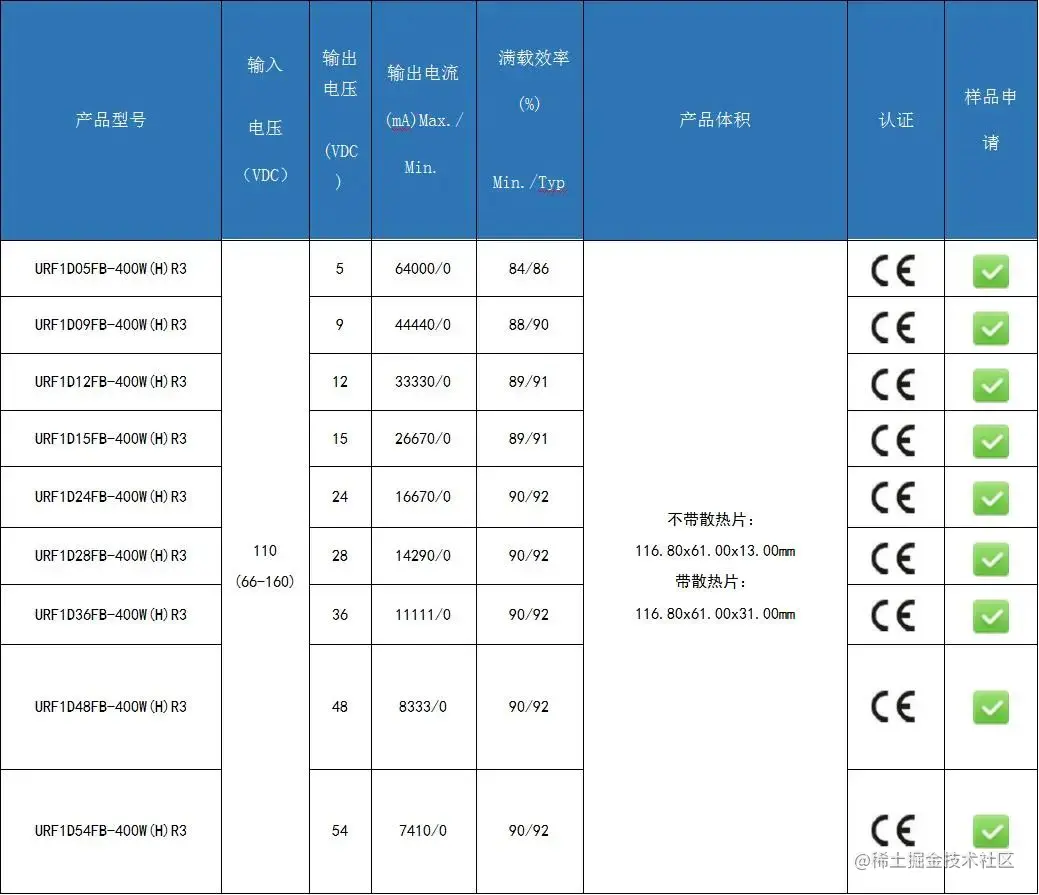 URF1D_FB-400(H)WR3系列工作温度范围宽至-40℃ to +100℃,具有优异的温度降额曲线,带来的器件发热量低,大大提升产品的寿命和可靠性。