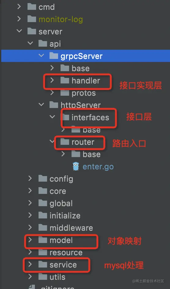从代码结构看,我目前go后端所需生成的文件有5个。首先是router,生成增删改查等几个路由,然后是接口文件interfaces层以及接口实现handler层文件,然后是service层,最后就是model层对象映射。
