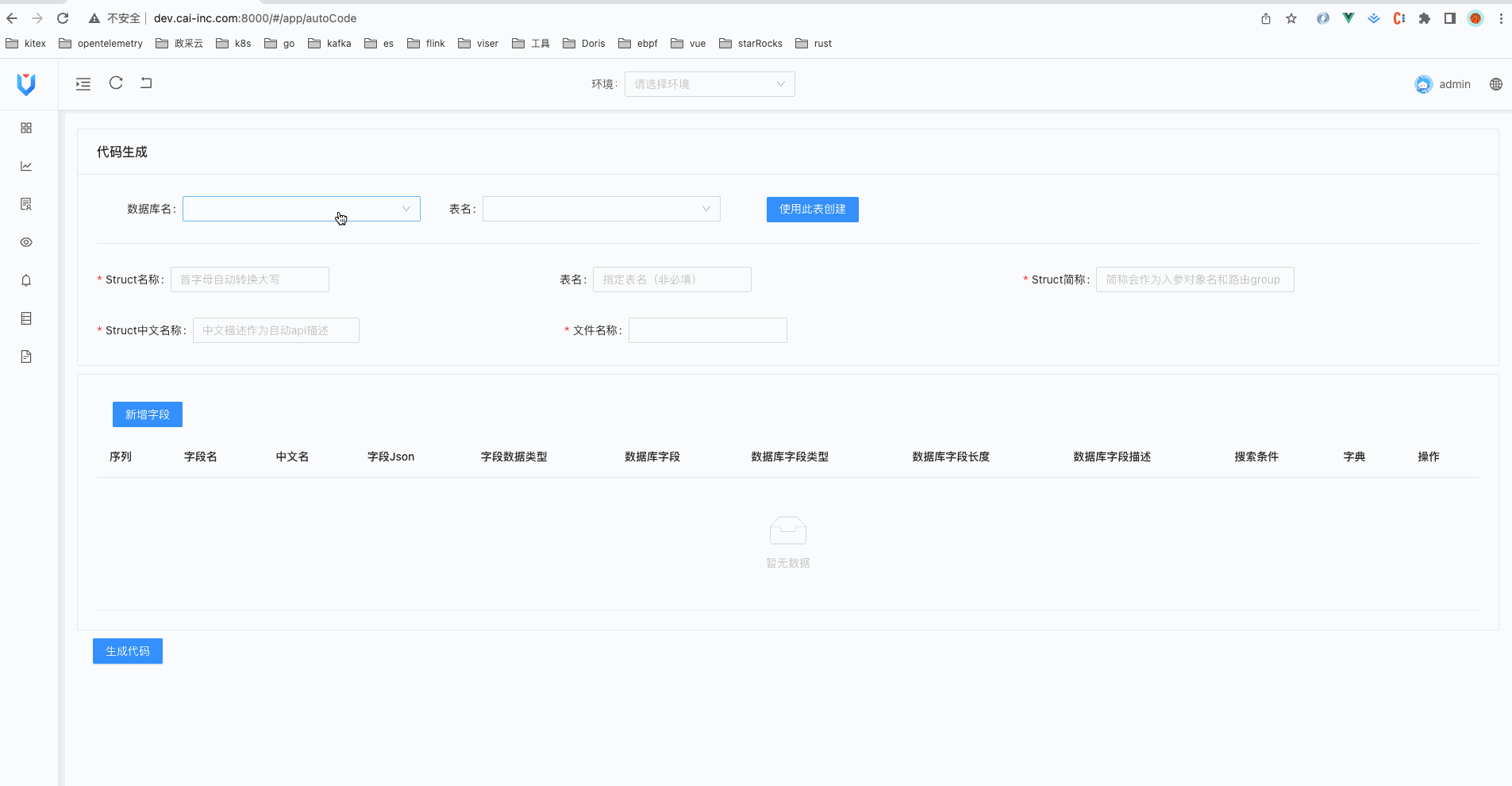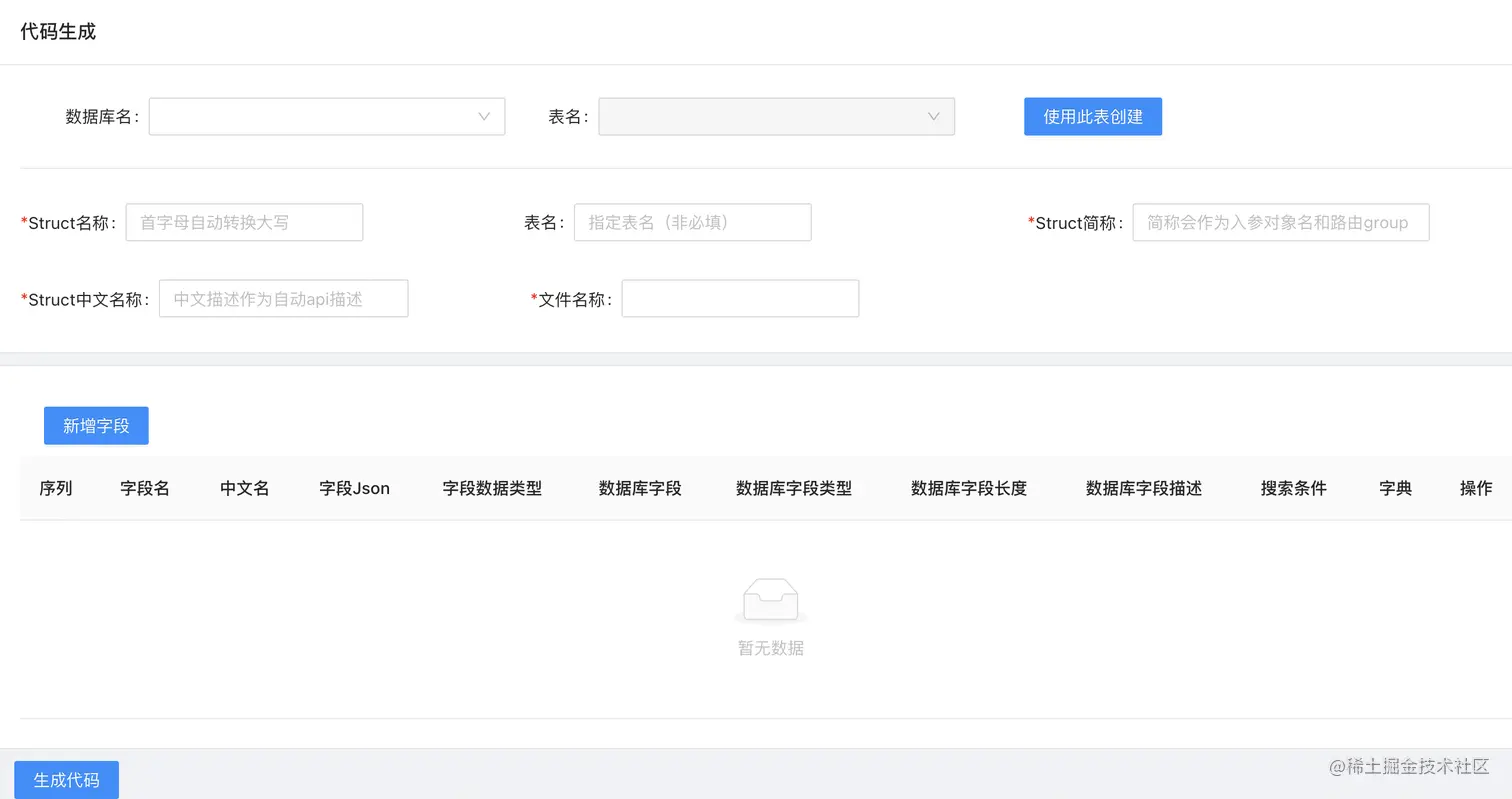 - 数据库表结构。所有的代码文件,前提是数据库表的存在,依赖表结构,生成对应的代码文件。遵循一切为了方便,在页面配置中可以添加表中没有的字段,或修改表字段基本信息。