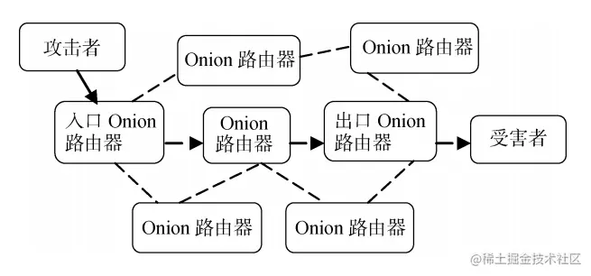 在这种攻击中,攻击者的攻击数据包通过匿名网络进行转发,在受害主机端,只能观察到攻击数据包来自于出口路由器,而不能发现真正的攻击者。