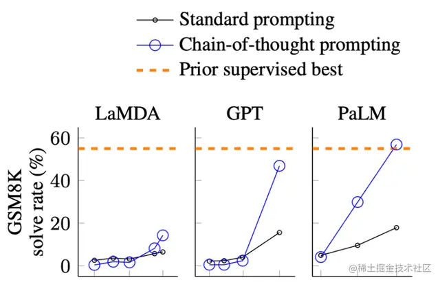 从效果来看: 思想链提示的性能明显优于其之前的精调方法(目前还没有能公平对比提示词和微调的工作。但当思维链被提出的时候,尽管他们对于提示和精调的比较可能是不公平的,但确实比精调效果要好)。