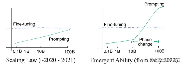 左图: 当模型大小呈指数增长,相应的模型性能呈线性增长。右图: 当模型尺寸达到一定规模时,会出现突现能力。