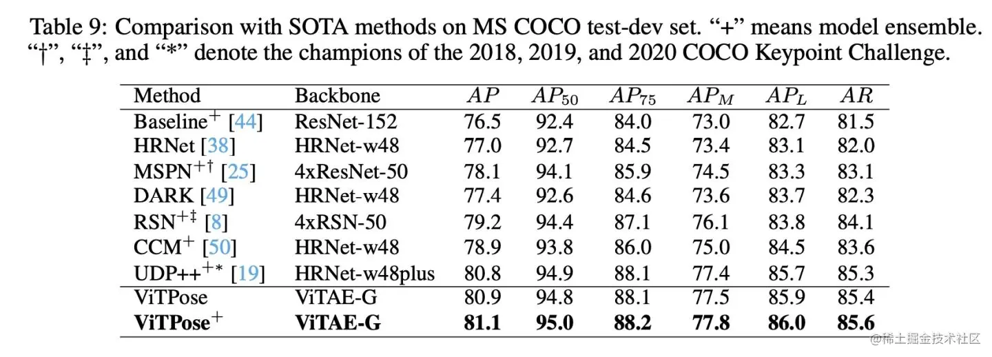 SOTA结果是在576x432输入,采用1B参数量的ViTAE-G作为backbone,使用MS COCO + AI Challenger训练的情况下获得的,具体如下: