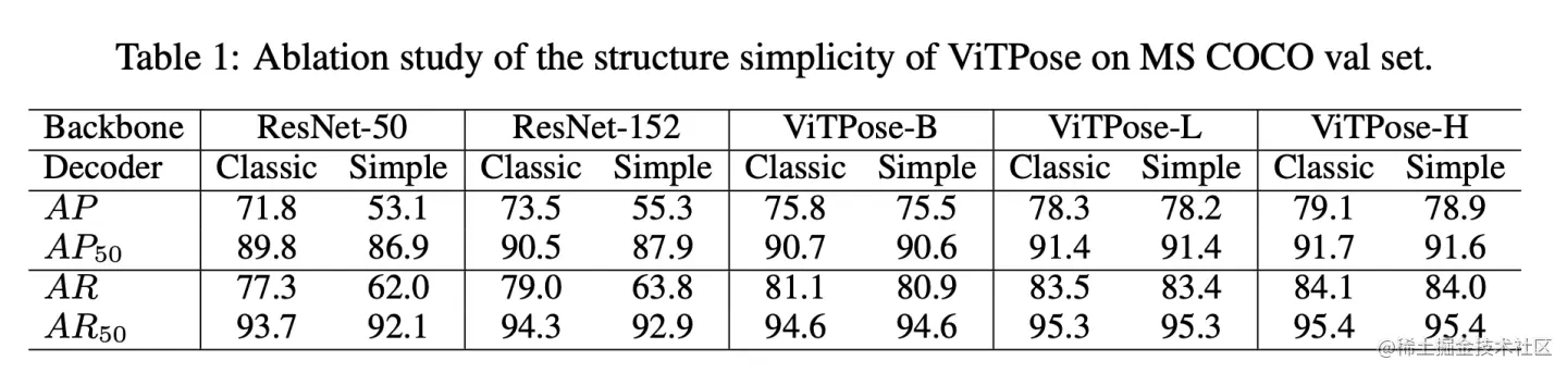 可以看到,ResNet系列在方案1上的结果远高于方案2,说明CNN结构的学习能力需要强有力的decoder来进一步加强,而VitPose结构则不需要,这需要归功于ViT结构的强大学习能力