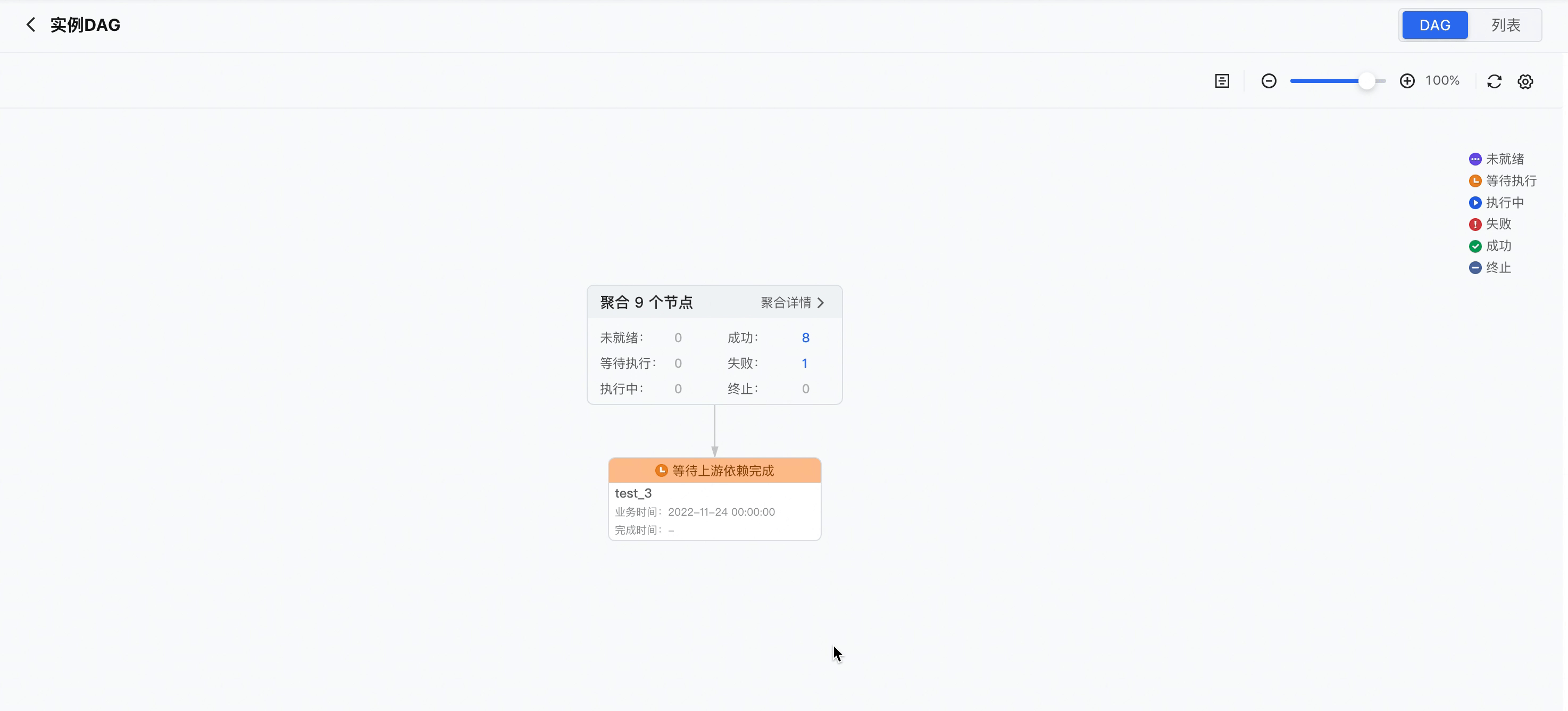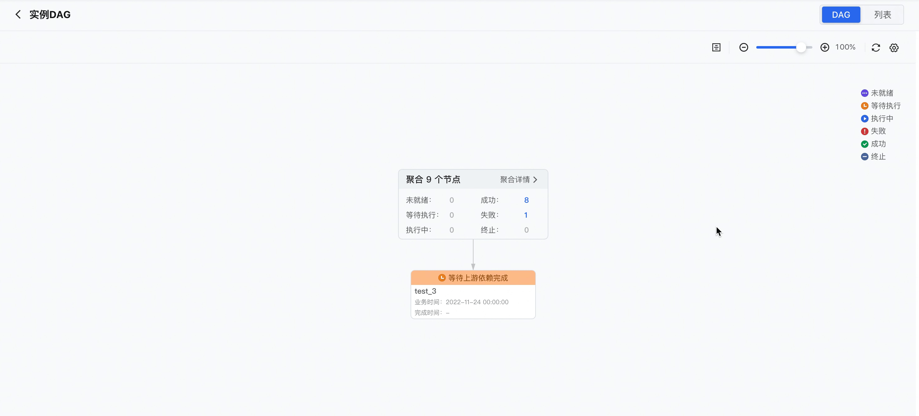 其次,以用户最关注的实例状态,对被聚合的节点进行分类,同时新增快捷展开操作。以下图为例,当前实例处于等待上游依赖完成状态,在这种情况下,用户关注的,则是上游没有开始执行的节点。在聚合节点中,可以清晰地看到存在一个实例,是在等待执行的,点击数字1,即可快速展开实例。