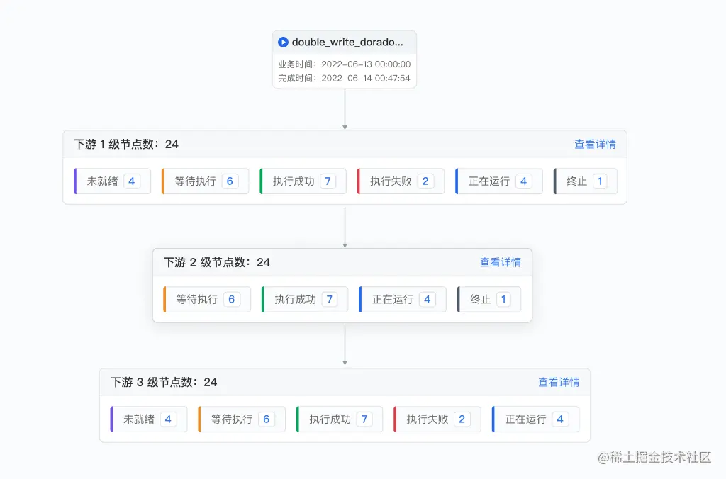 - 在统计模式中,用户关注的是依赖当前节点的下游节点,下游节点则可以分成直接下游和所有下游。所以设计了分层模式和合并模式,在这两种模式下,可以按照任务的属性(任务类型 / 实例状态 / 责任人等)作为分组维度。