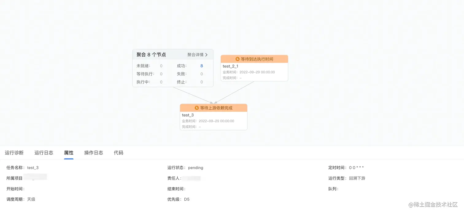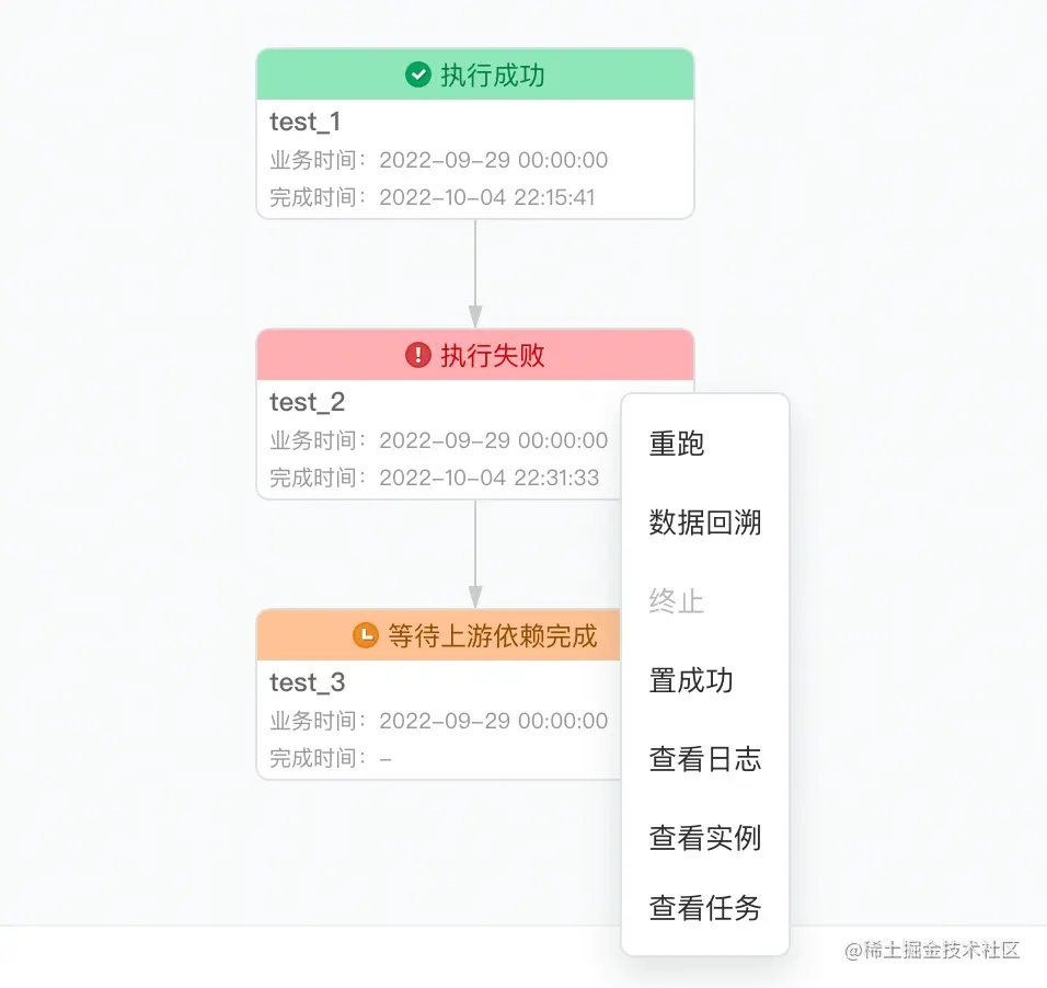 对于任务 test_3 在 2022-09-29 的实例进行分析可知。当前实例没有运行,是由于上游任务 test_2 在 2022-09-29 的实例运行失败导致的,那么此时可联系上游实例对应的任务的负责人,对实例进行处理(包括但不限于重跑,置成功等操作)。