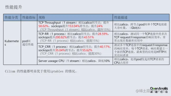 经过我们的测试,如果用 Cilium 替换 calico,用 TCP Throughput 模式测,那么 pod 间的通讯性能 tcp 吞吐量提升 58%、sockops 提升 153%、跨节点也能提升 24%。