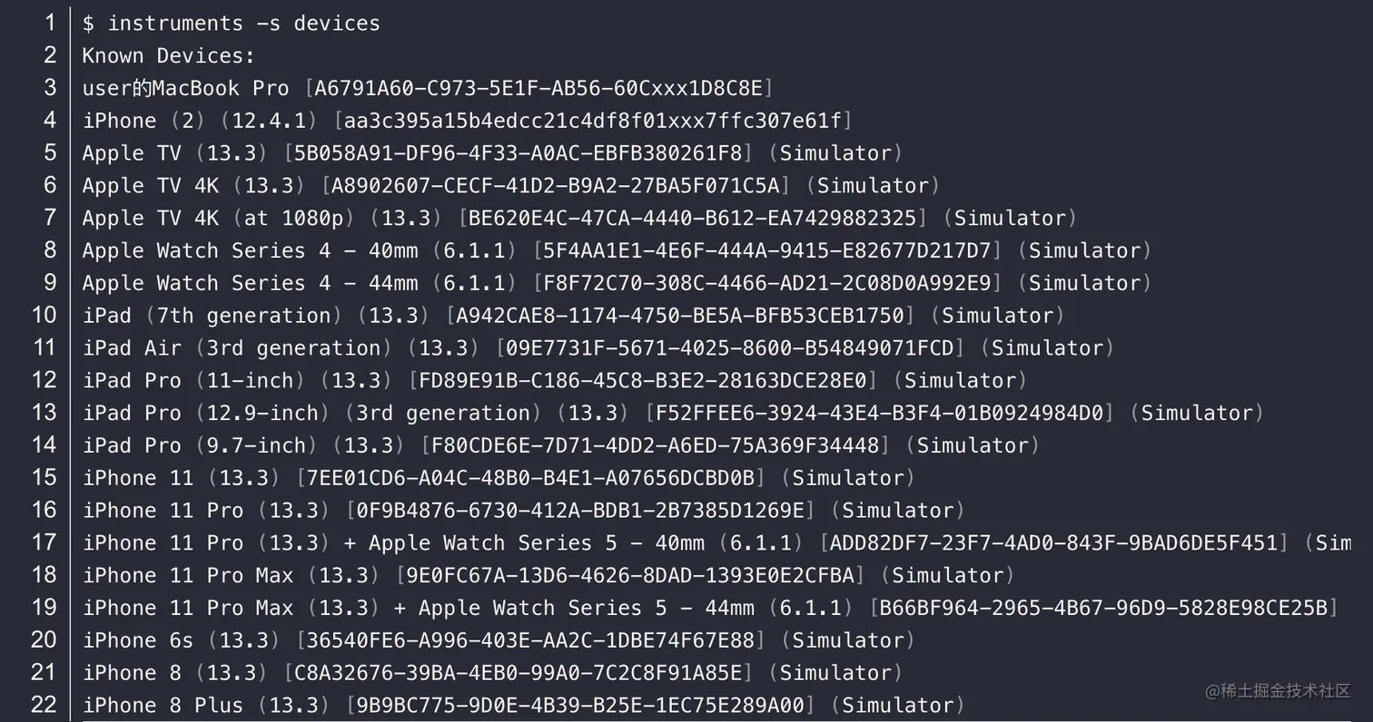 查看模拟器列表:instruments -s devices 运行结果如下,可以看到最前面两行显示的其实是本机的 Mac 和连接的 iPhone 真机,剩下的是模拟器。