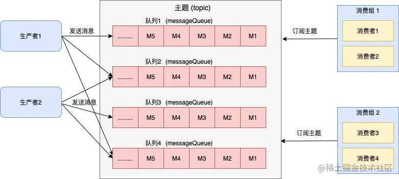 - 一对多通信:基于独立身份的设计,同一个主题内的消息可以被多个订阅组处理,每个订阅组都可以拿到全量消息。因此发布订阅模型可以实现一对多通信。