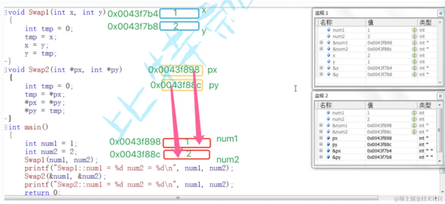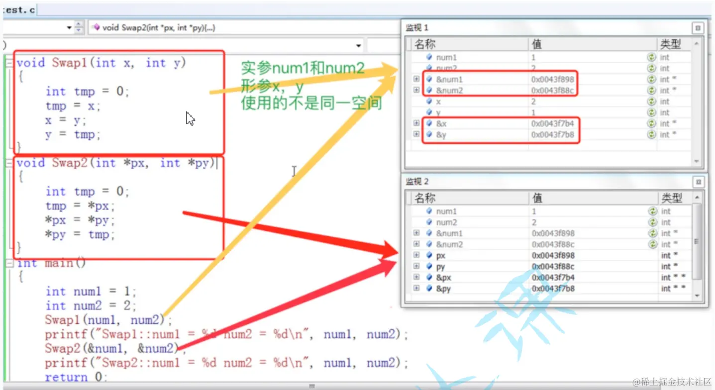 上面 Swap1 和 Swap2 函数中的参数 x,y,px,py 都是形式参数。在main函数中传给 Swap1 的 num1 , num2 和传 给 Swap2 函数的 &num1 , &num2 是实际参数。 这里我们对函数的实参和形参进行分析
