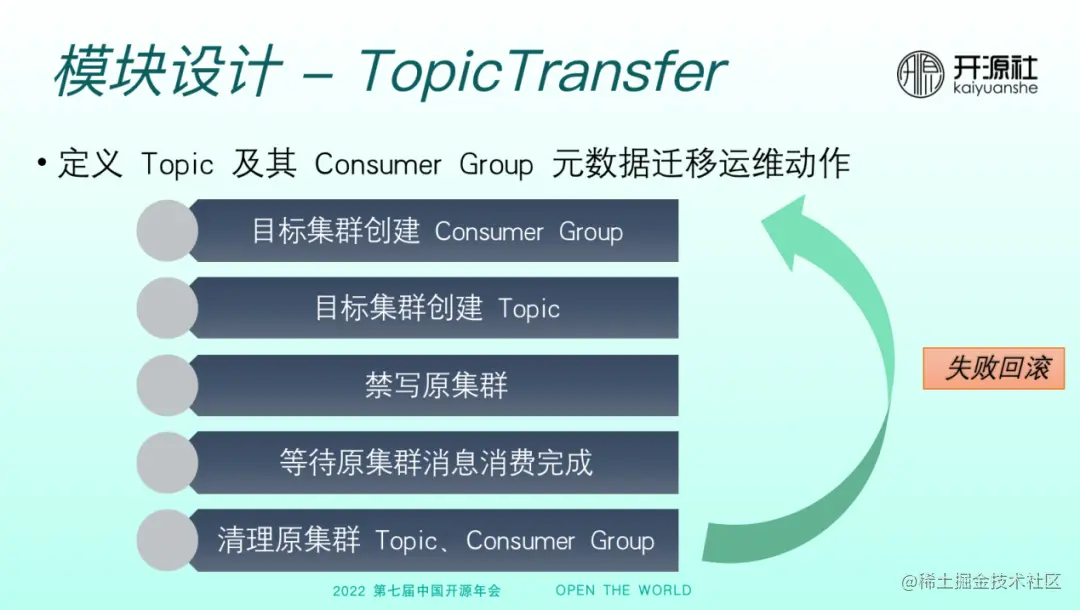 TopicTransfer 不是与 RocketMQ 直接映射的模块,它定义了 Topic 和 Consumer Group 元数据迁移运维操作。使用 TopicTransfer 迁移元数据时,首先在目标集群创建指定的 Consumer group 和 Topic ;创建完成后禁写原集群,使得消息不会发送到原集群;等待原集群的消息消费完成后,会将原集群的元数据进行清理。在此过程中,任何一步失败均会进行回滚,确保元数据正确迁移。