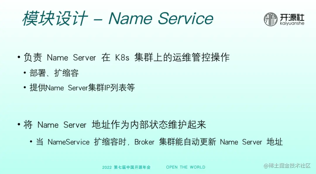 Name Service 模块负责 NameServer 在 Kubernetes 集群的运维管控操作,包括部署、扩缩容、提供 NameServer 集群IP列表等。Broker 需要向 NameServer 注册路由信息,因此 NameServer 的地址极为重要,需要作为内部状态实时地进行维护。当 NameServer 进行扩缩容时,Broker 集群能够自动感知 NameServer 地址的更新。