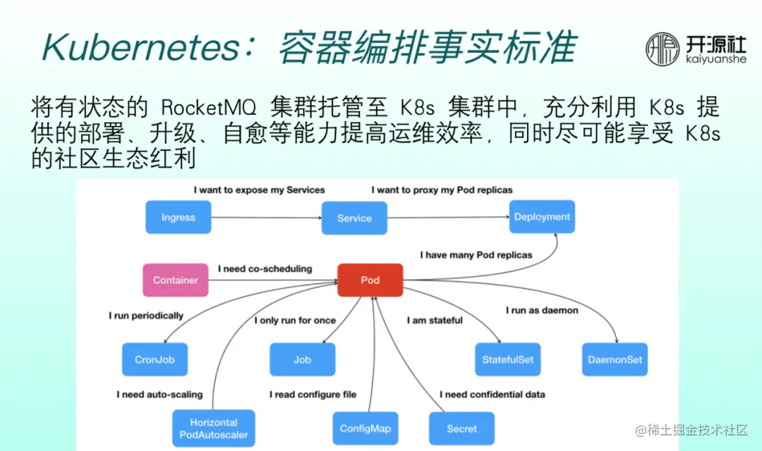 为了解决上述问题,社区借鉴了面向接口编程的思路:不直接操作基础设施,而是通过标准接口。而 Kubernetes 正是这样一个容器编排的“标准接口”。于是,社区在解决 RocketMQ 在云基础设施的部署问题时,选择基于 Kubernetes 进行部署,不同云厂商负责从 Kubernetes 到具体云 IaaS 层的调度:将有状态 RocketMQ 集群托管到 Kubernetes 集群,充分利用 Kubernetes 提供的部署、升级、自愈相关能力,同时也能享受到 Kubernetes 社区的生态红利。