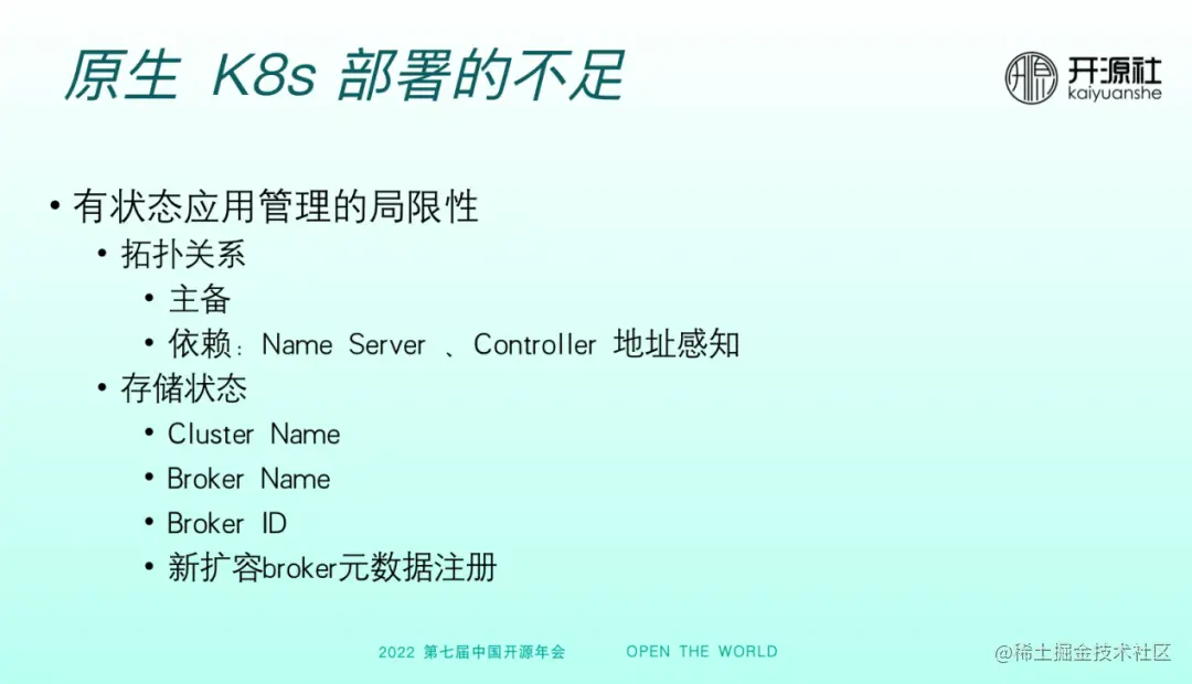 另外, Kubernetes 在支持有状态应用的管理上也存在局限。RocketMQ 集群的状态可归纳为两块。其一为集群拓扑关系,包括 RocketMQ Broker 主备关系以及 RocketMQ 不同模块之间的相互依赖(比如 Broker 需要依赖 NameServer、Controller 等);其二为存储状态,包括 Cluster 名称、 Broker 名称、 Broker ID 、新扩容 Broker 元数据等。