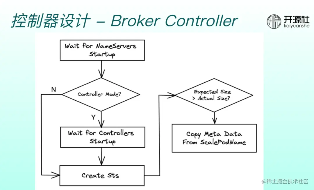Dledger Controller 先创建 Headless Service 用作组建 Controller 集群时服务发现的入口,接着判断 Controller 节点数量是否与期望值一致,如果不一致,则创建 StatefulSet。创建 StatefulSet 时会自动为每个 Dledger Controller 分配 controllerDledgerSelfId。期望节点数目与实际节点数目一致后,才会暴露 Controller 的 Service 地址,供 Broker 访问。