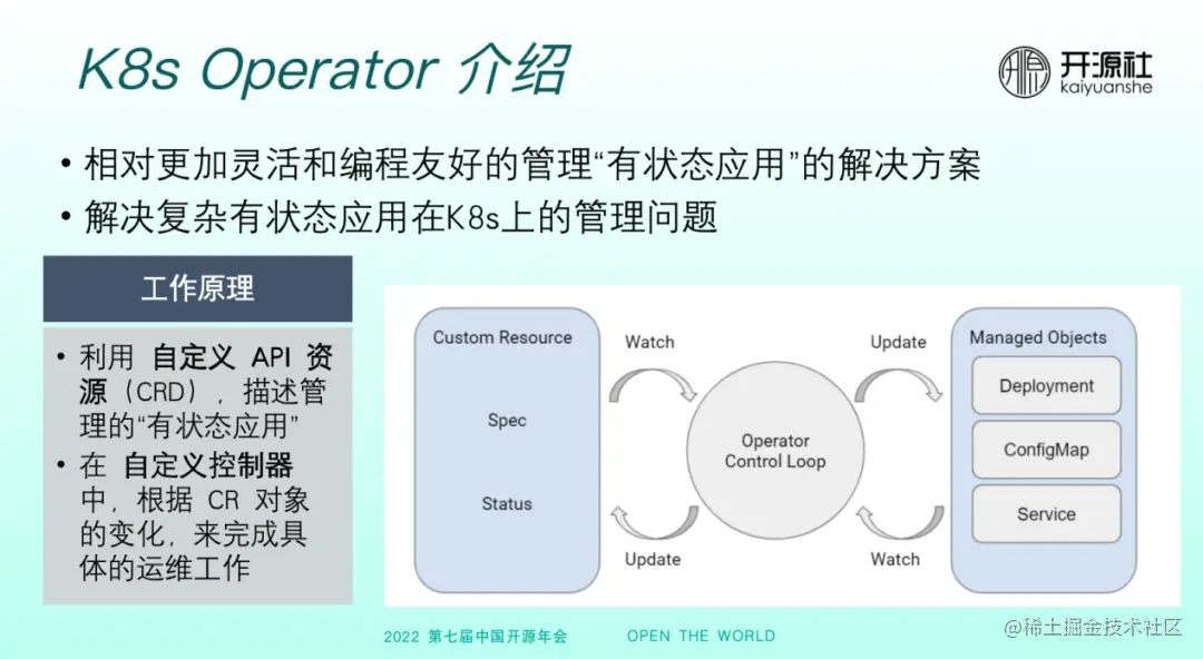Kubernetes Operator 是一种相对简单灵活且编程友好的管理应用状态的解决方案。其工作原理分为两部分:一部分是利用自定义 API 资源( CRD )描述管理状态应用,可以认为是一个面向用户的接口,用户描述需要部署或运维的资源;另一部分是自定义控制器,根据自定义资源对象的变化完成运维动作。