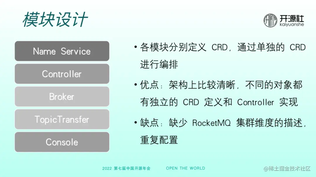 目前 RocketMQ Operator 的模块有 Name Service、Controller、Broker、TopicTransfer 和 Console,与 RocketMQ 模块基本一致。各模块通过不同 CRD 进行编排,其优点为架构、代码比较清晰,不同对象均有独立的 CRD 定义和对应的 Controller 实现。缺点为缺少 RocketMQ 集群维度的描述,代码实现、配置上可能存在重复。关于 CRD 的演进,欢迎社区同学结合各自的实践提出建议。
