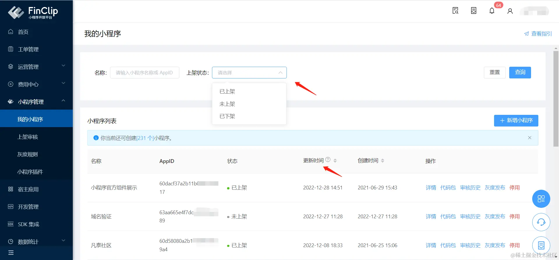 考虑到 FinClip 的用户在管理平台上创建小程序增多,为了管理更加方便,我们在原有小程序创建列表中,增加了按照“状态”筛选功能,同时增加“更新时间”标识小程序状态的变化,并提供排序功能。以此让开发者用户们,能更快更方便的关注到自己上线和发布的小程序。