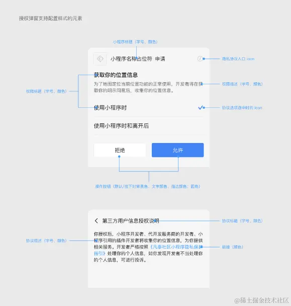 根据用户给我们的反馈,希望能把小程序权限弹窗实现可配置,以此来实现弹窗与小程序整体的风格统一,于是我们对弹框内的文字字号、颜色和 icon 等元素进行抽象为了方法实现可配置,以此降低 App 侧开发的成本。具体实现方法可以参考文档中心设置小程序权限弹框进行调用设置。