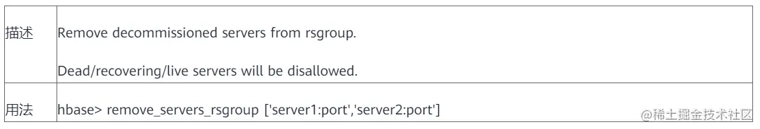 从RSGroup中删除已退服的Region server。 无法对处于Dead/recovering/live状态的Region server进行该操作。